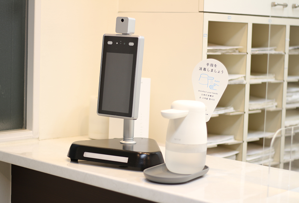 受付には自動の手指消毒器と、顔を向けるだけの体温計測器がございます!